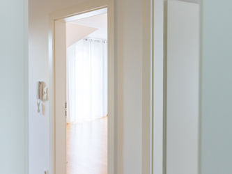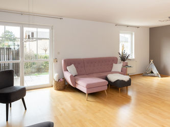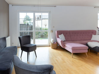 Das Erdgeschoss empfängt Sie mit einem freundlichen Vorraum. Von hier aus gelangen Sie in das großzügige Wohnzimmer, das dank großer Fensterflächen lichtdurchflutet ist und direkten Zugang zur Terrasse sowie in den Garten bietet. Die Küche ist durch einen stilvollen Rundbogen vom Wohnbereich getrennt – offen genug für ein kommunikatives Wohngefühl, gleichzeitig klar gegliedert. Ein praktischer Abstellraum ergänzt die Küche ideal. Ein separates WC rundet diese Ebene ab.